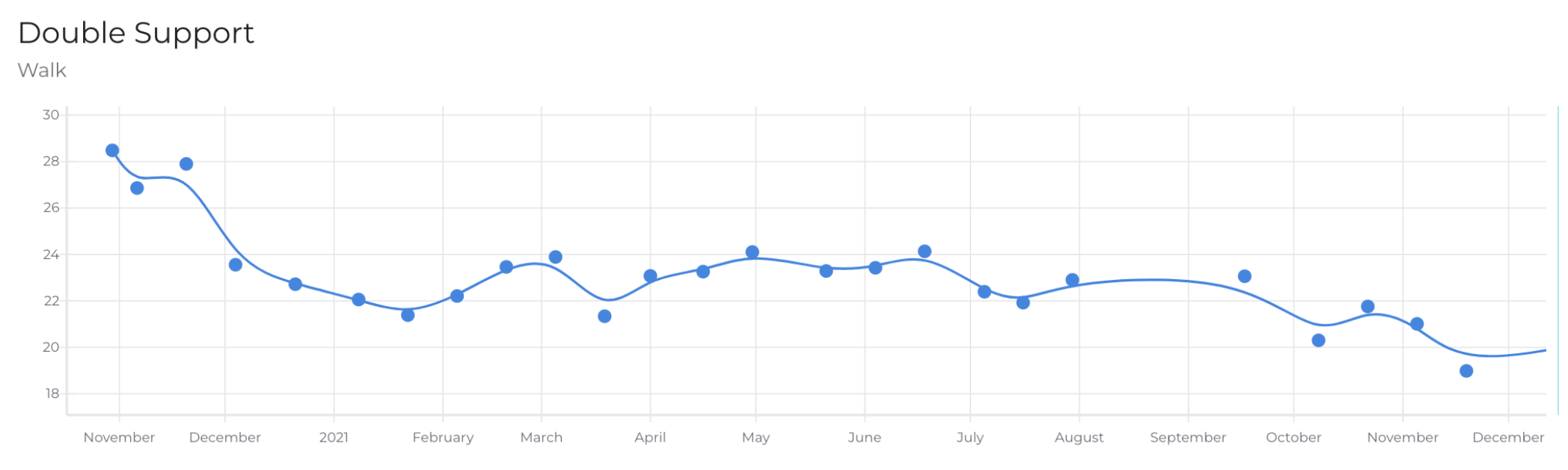 In addition to speed, there was a focus on balance and confidence, which is often reflected in double support. Note that double support is also correlated with speed, but this metric was used as a means of knowledge translation, illustrating that if he could become more confident in being on one foot at a time, he could also walk faster. Balance drills were incorporated, and over the course of a year, Dwight reduced his double support from 28.48% to 18.99%. The norm for a healthy individual is 20%, so this was a very impressive improvement.