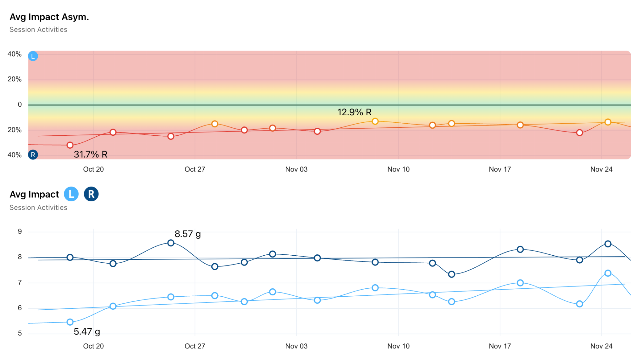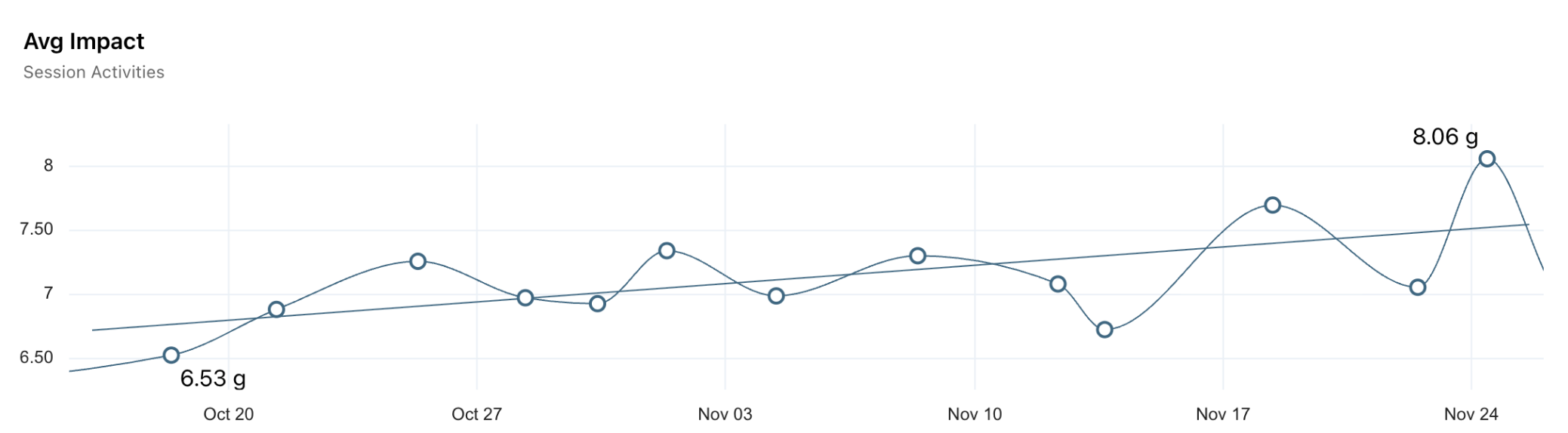The averaged value makes it easy to identify global trends over time, and keeps graphs clean when you have multiple activity types on the same plot. In the Avg Impact graph below, you can see that this athlete’s impact has increased from Oct 20 to Nov 24. In this case, that indicates improving load capacity, as this athlete is rehabbing from an injury.