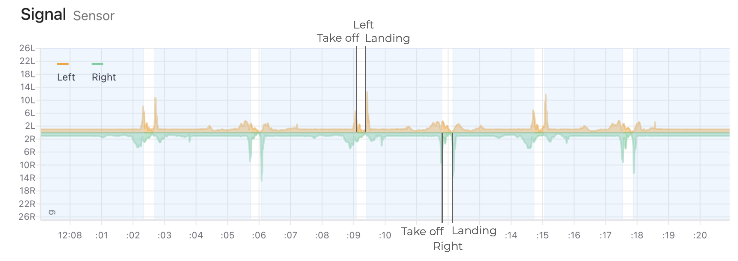 The main features that are visible in the Signal graph are the take off and landing. Some individuals will present different take off and landing shapes on each foot. Before drawing any conclusions from this, make sure to check that this is a persistent pattern throughout the whole activity, and not a one off.