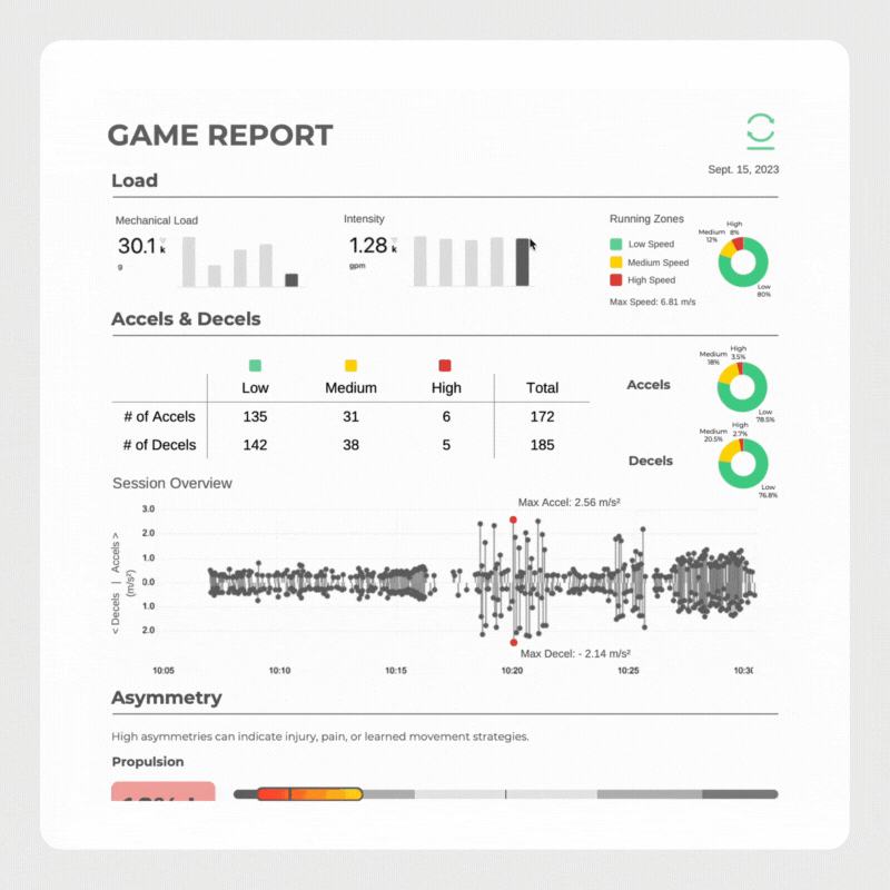 IMU sensors embedded in insoles/orthotics/shoes capture precise movement asymmetries, loads, and variabilities across all movement types.